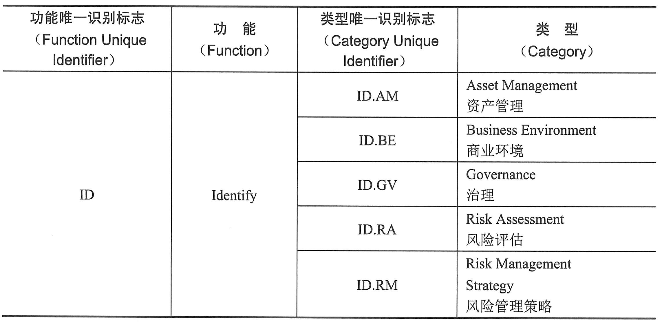 NIST网络安全框架识别功能对应分类表