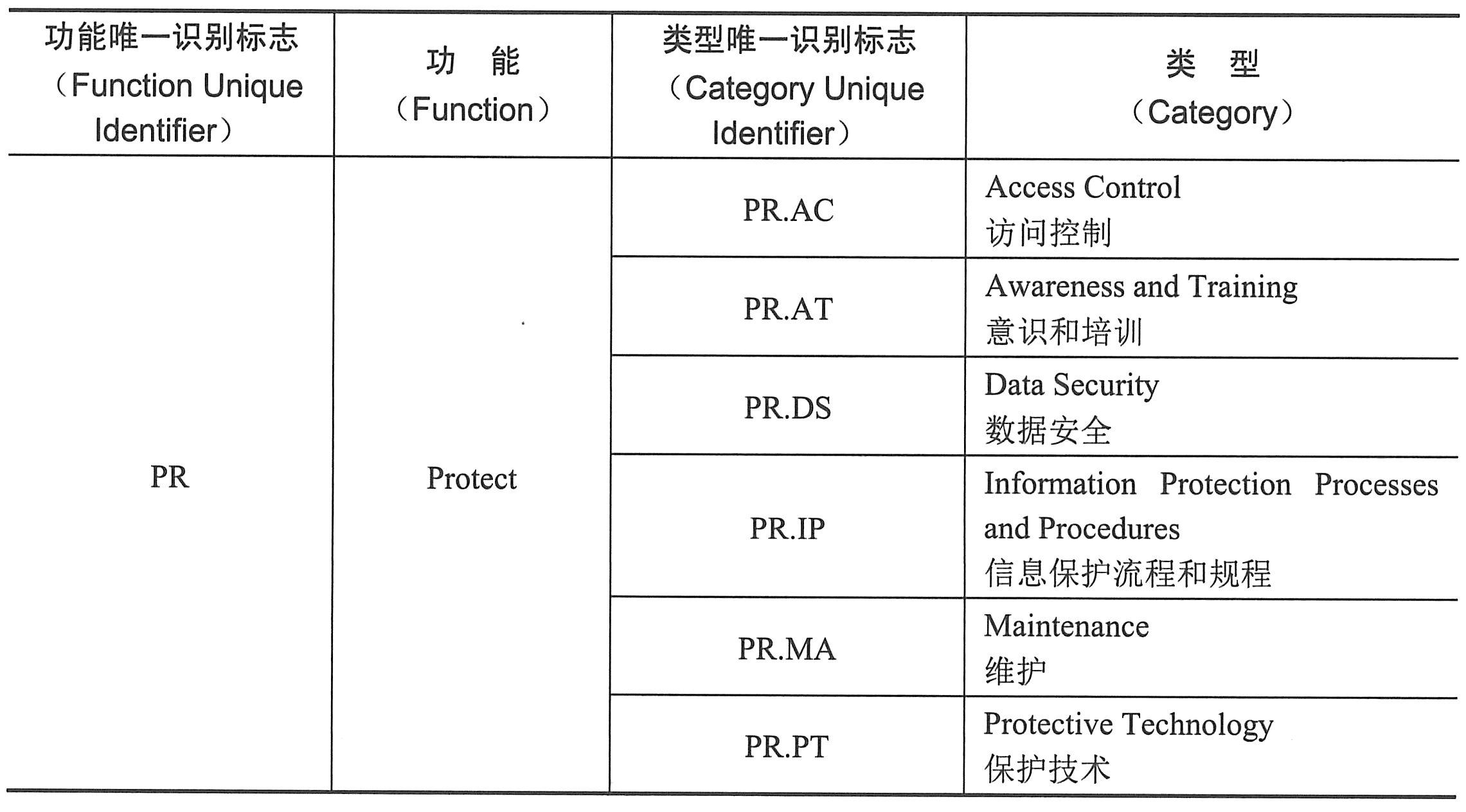 NIST网络安全框架保护功能对应分类表
