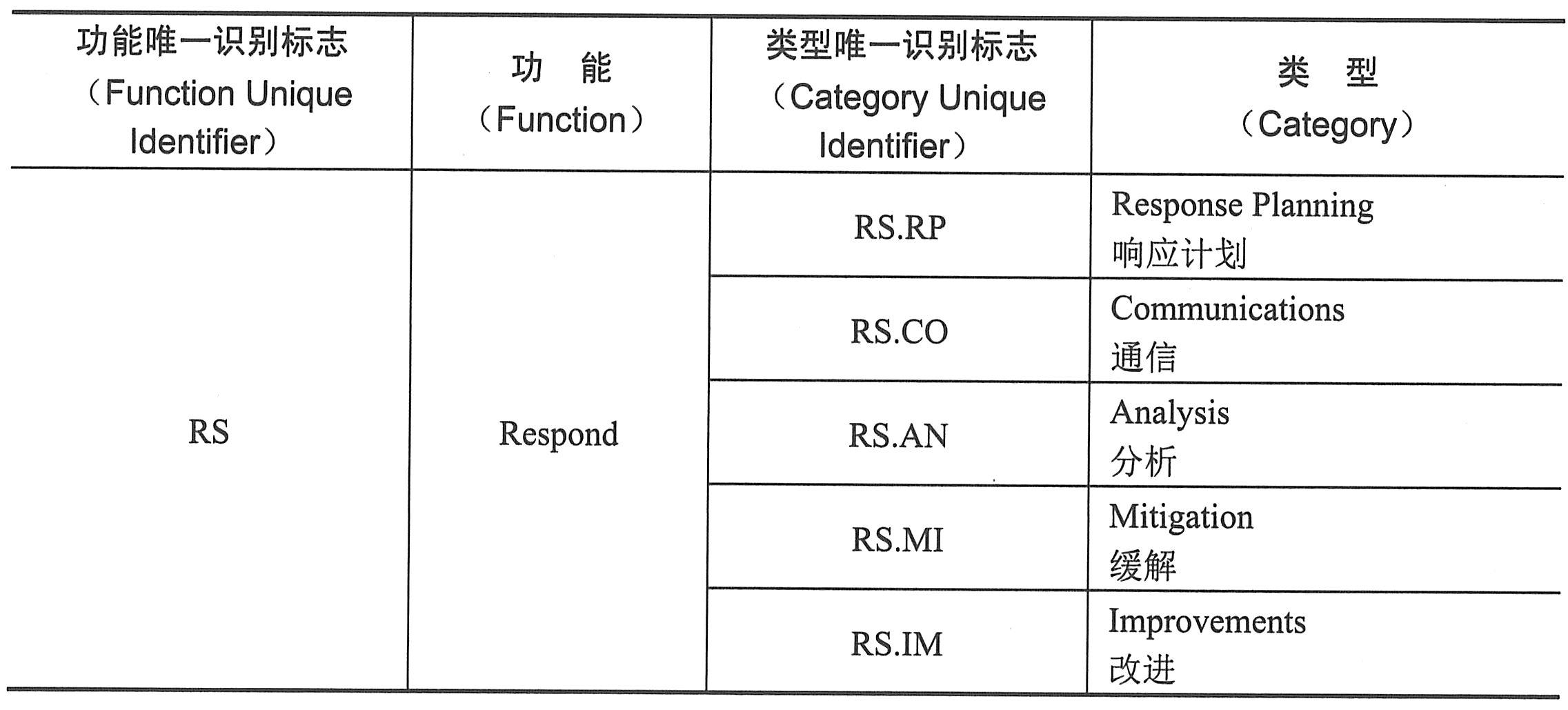 NIST网络安全框架响应功能对应分类表