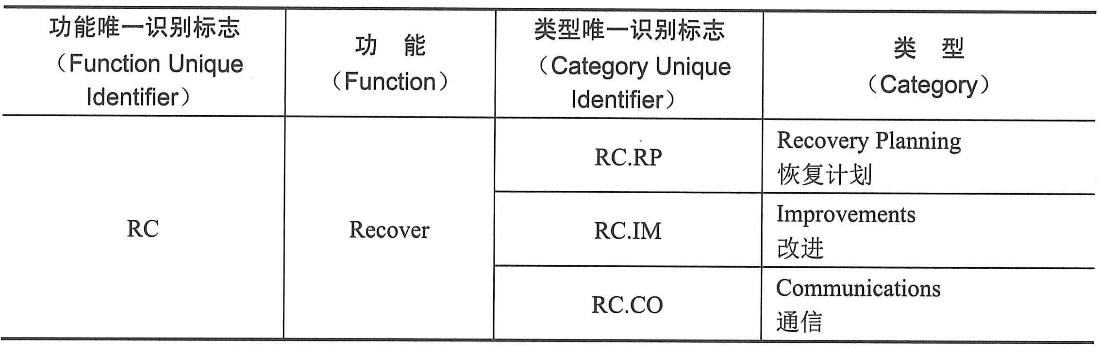 NIST网络安全框架恢复功能对应分类表