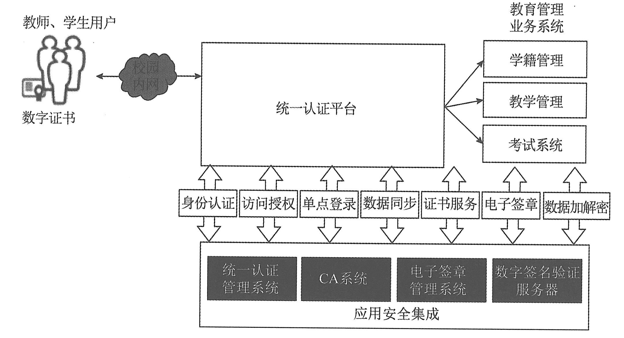 校园信息化的主要特点是以校园网络为基础,利用信息技术让学校教育科研机构、教育科研基础设施、教学资源等实现数字化、网络化、信息化,使得校园内的教师、学生可以利用计算机网络进行各种教学、科研和管理活动。与此同时,校园网络面临各种网络安全风险,其中包括身份冒用、信息泄密、数据篡改等问题。针对上述问题,某数字证书认证中心给出了校园网信任体系建设方案,该方案描述如下。