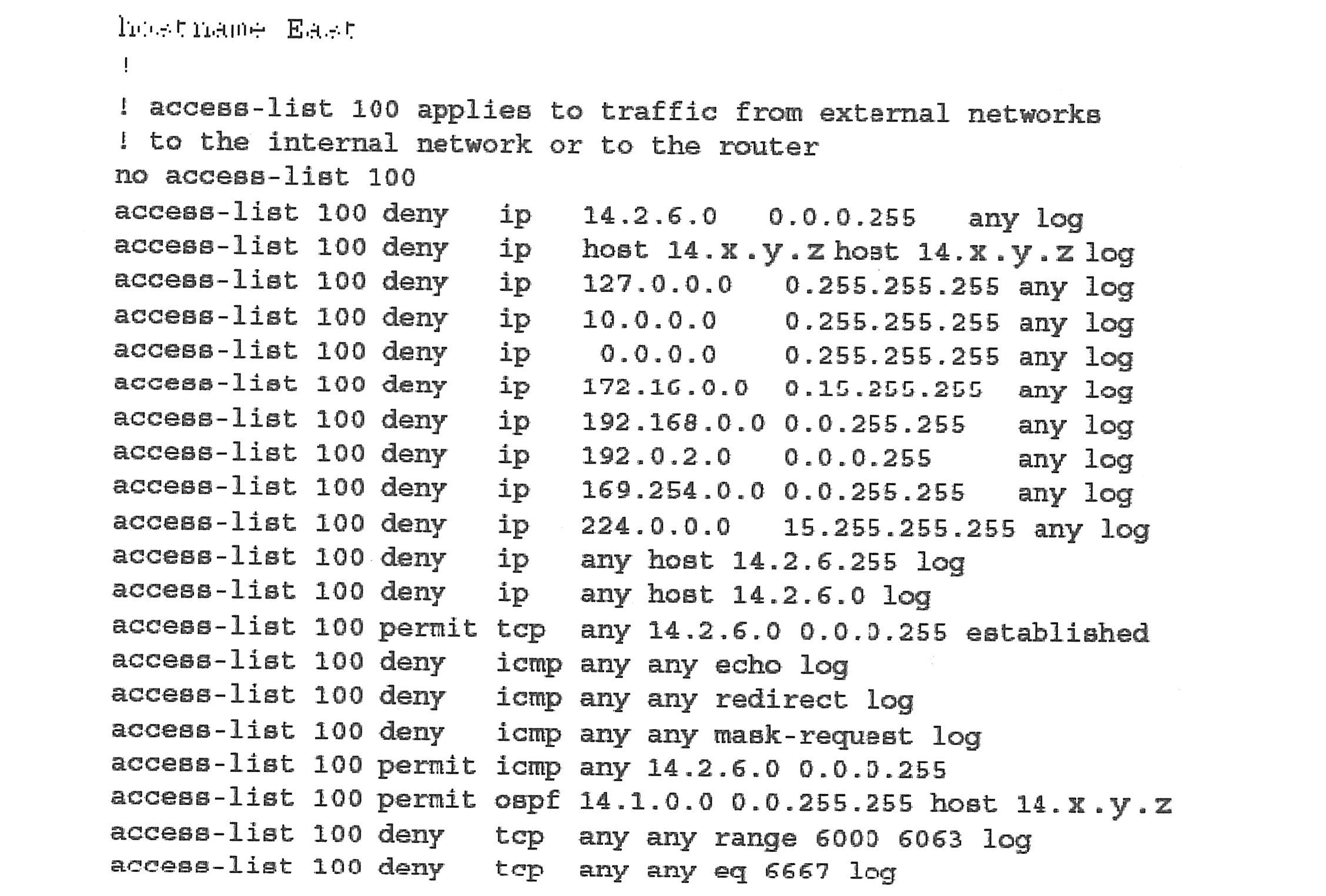 根据上述网络安全策略,路由器的过滤规则安全配置信息如下。