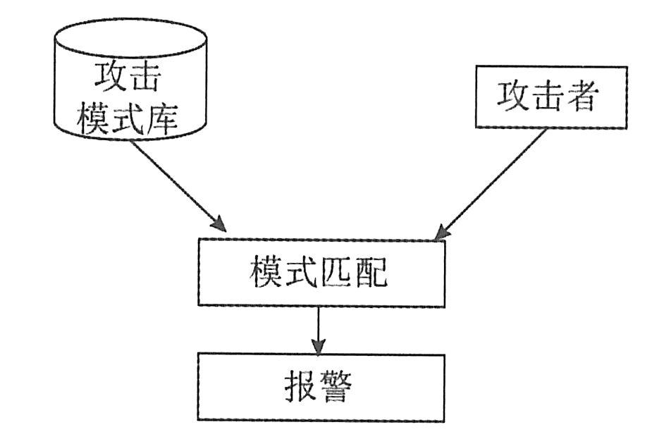误用入侵检测通常称为基于特征的入侵检测方法,是指根据已知的入侵模式检测入侵行为。攻击者常常利用系统和应用软件中的漏洞技术进行攻击,而这些基于漏洞的攻击方法具有某种特征模式。如果入侵者的攻击方法恰好匹配上检测系统中的特征模式,则入侵行为立即被检测到,如下图所示。