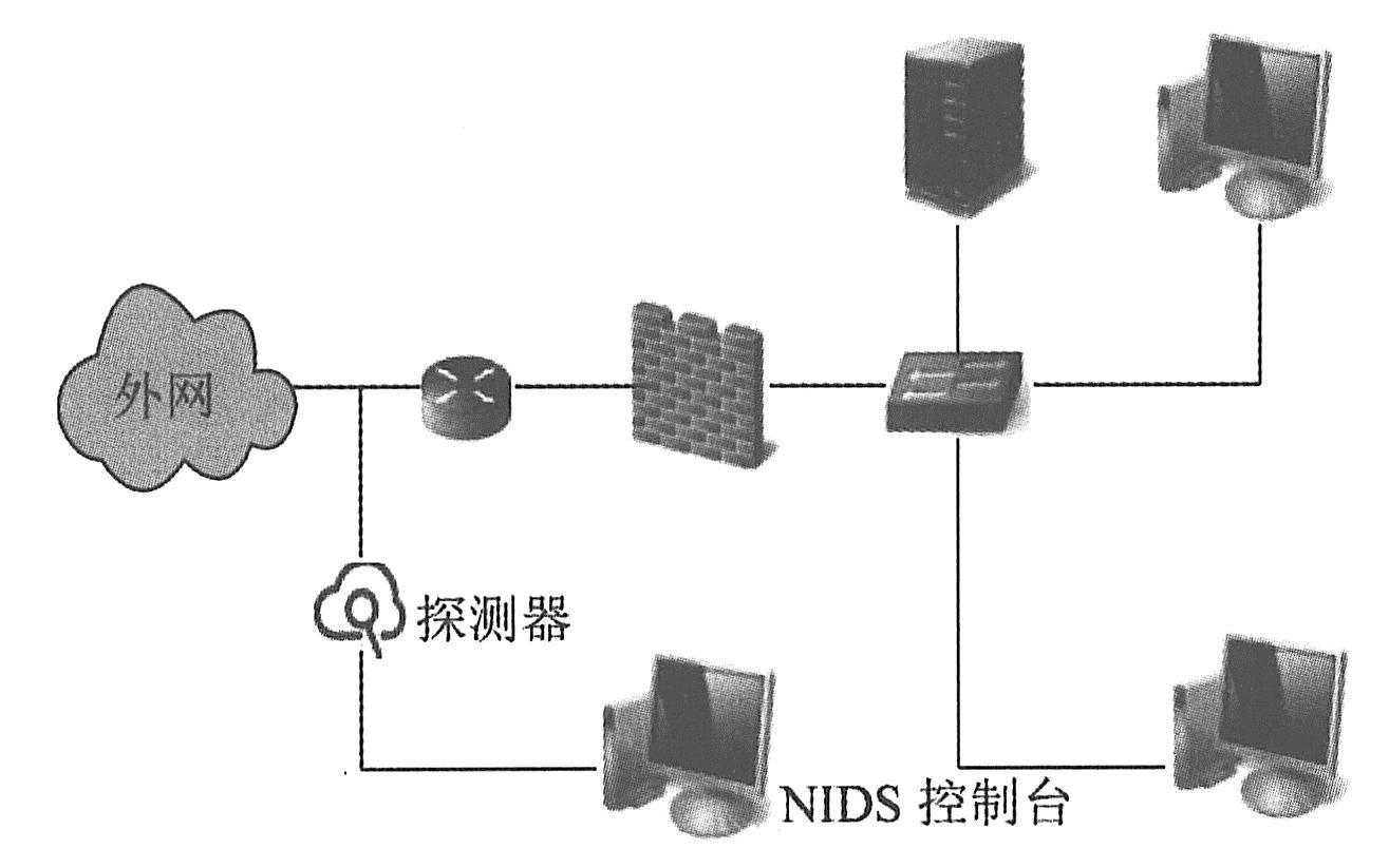 将NIDS的探测器接在网络边界处,采集与内部网进行通信的数据包,然后分析来自外部的入侵行为,如下图所示。