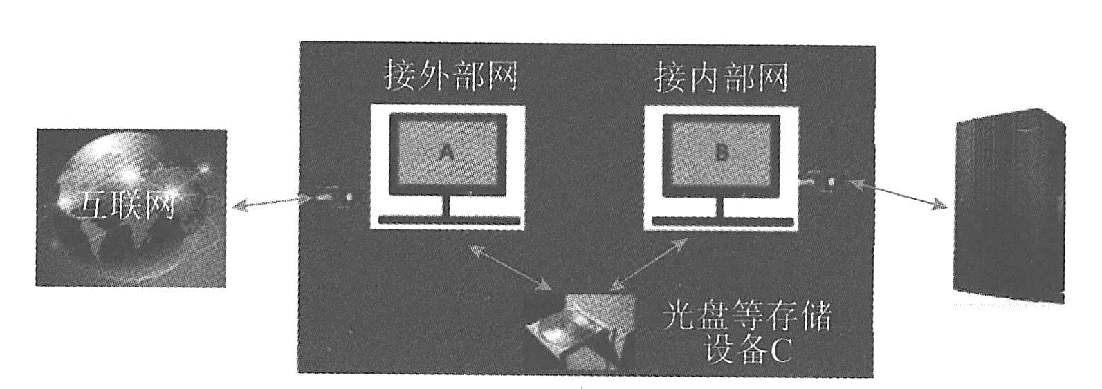 在内部网指定一台或多台计算机充当服务器,负责专门搜集外部网的指定信息,然后把外网信息手工导入内部网,供内部用户使用,从而实现内部用户“上网”,又切断内网与外网的物理连接,避免内网的计算机受到来自外网的攻击,如下图所示。