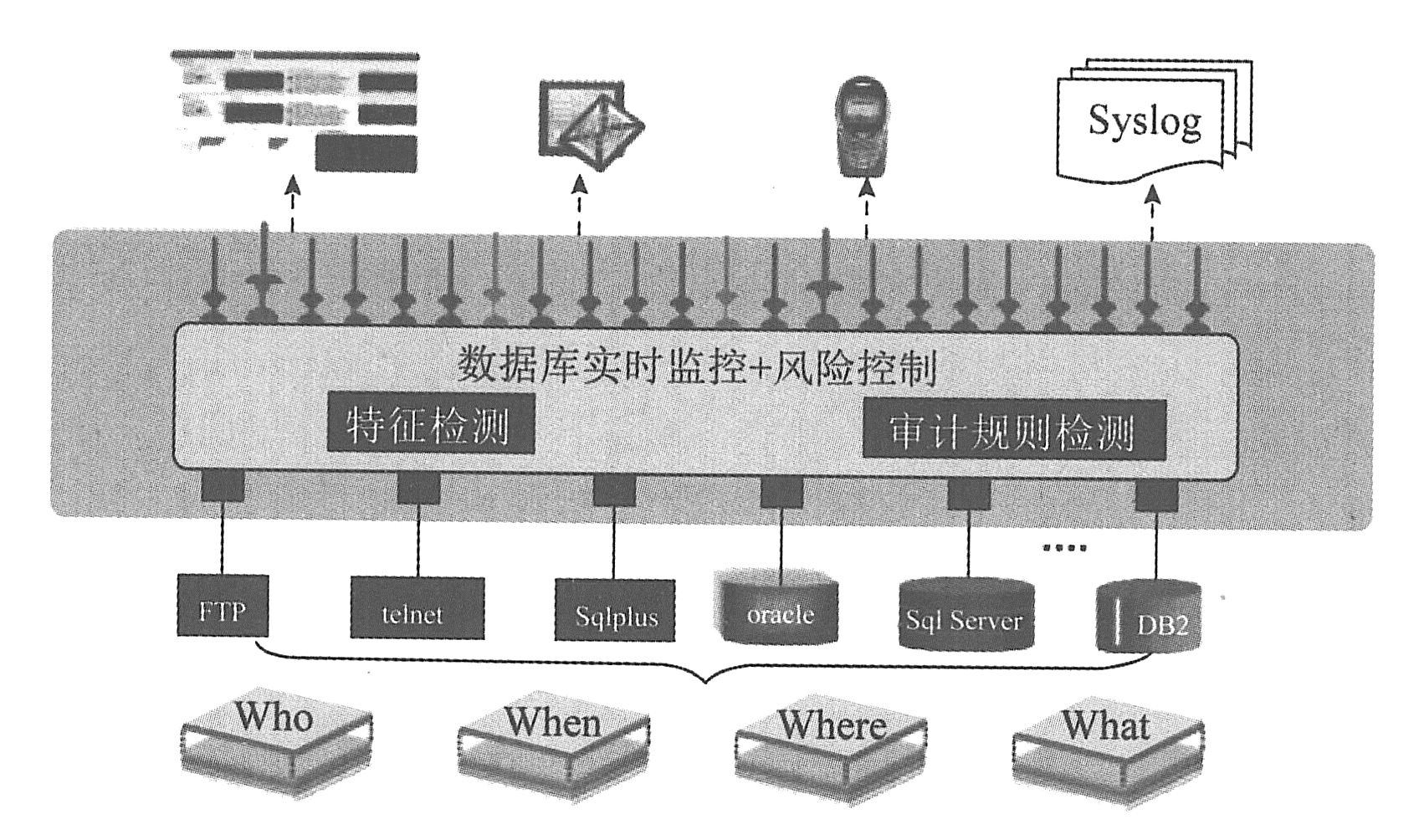 数据库承载企事业单位的重要核心数据资源,保护数据库的安全成为各相关部门的重要职责。数据库安全审计产品就是通过安全监测,智能化、自动地从海量日志信息中,发现违规访问或异常访问记录,从而有效降低安全管理员日志分析的工作量,如下图所示。