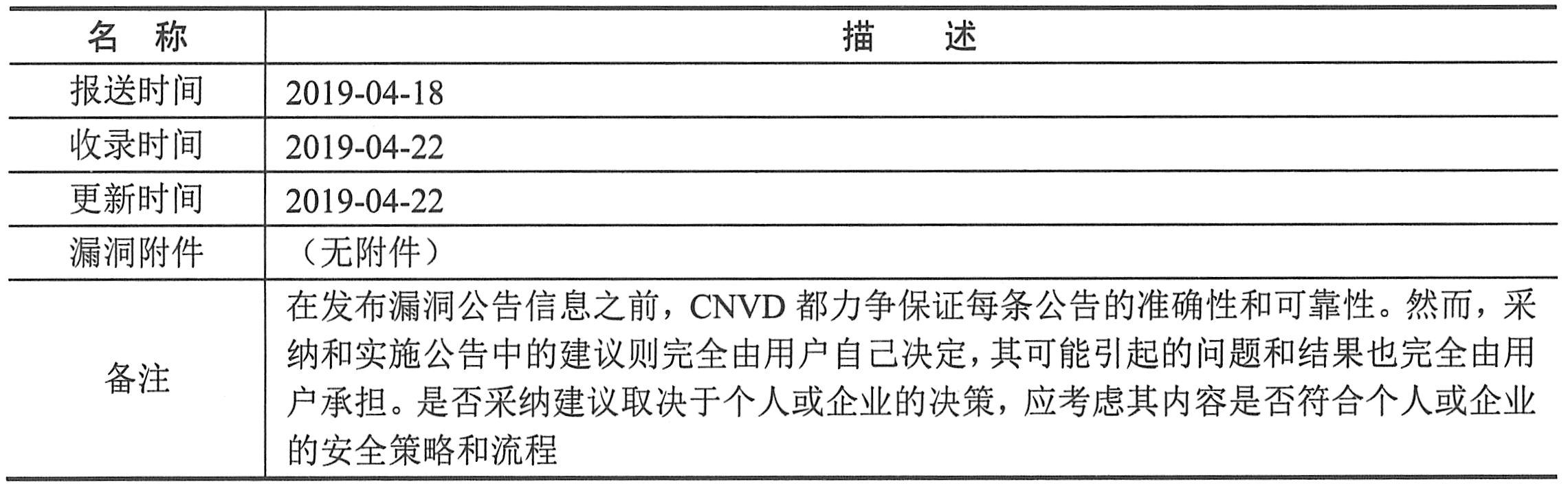 安全漏洞发布机制是一种向公众及用户公开漏洞信息的方法。及时将安全漏洞信息公布给用户,有利于帮助安全相关部门采取措施及时堵住漏洞,不让攻击者有机可乘,从而提高系统的安全性,减少漏洞带来的危害和损失。安全漏洞发布一般由软硬件开发商、安全组织、黑客或用户来进行。漏洞发布方式主要有三种形式:网站、电子邮件以及安全论坛。网络管理员通过访问漏洞发布网站、安全论坛或订阅漏洞发布电子邮件就能及时获取漏洞信息。漏洞信息公布内容一般包括:漏洞编号、发布日期、安全危害级别、漏洞名称、漏洞影响平台、漏洞解决建议等。例如,国家信息安全漏洞共享平台发布的Oracle MySQL Server拒绝服务漏洞(CNVD-2019-11750)信息,如下表所示。