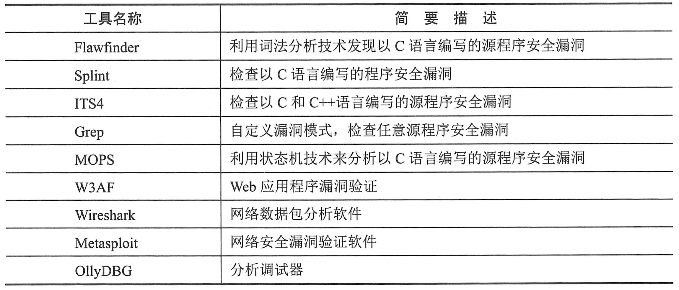 网络安全漏洞的发现方法主要依赖于人工安全性分析、工具自动化检测及人工智能辅助分析。安全漏洞发现的通常方法是将已发现的安全漏洞进行总结,形成一个漏洞特征库,然后利用该漏洞库,通过人工安全分析或者程序智能化识别。漏洞发现技术主要有文本搜索、词法分析、范围检查、状态机检查、错误注入、模糊测试、动态污点分析、形式化验证等。典型的网络安全漏洞发现常见工具如下表所示。
