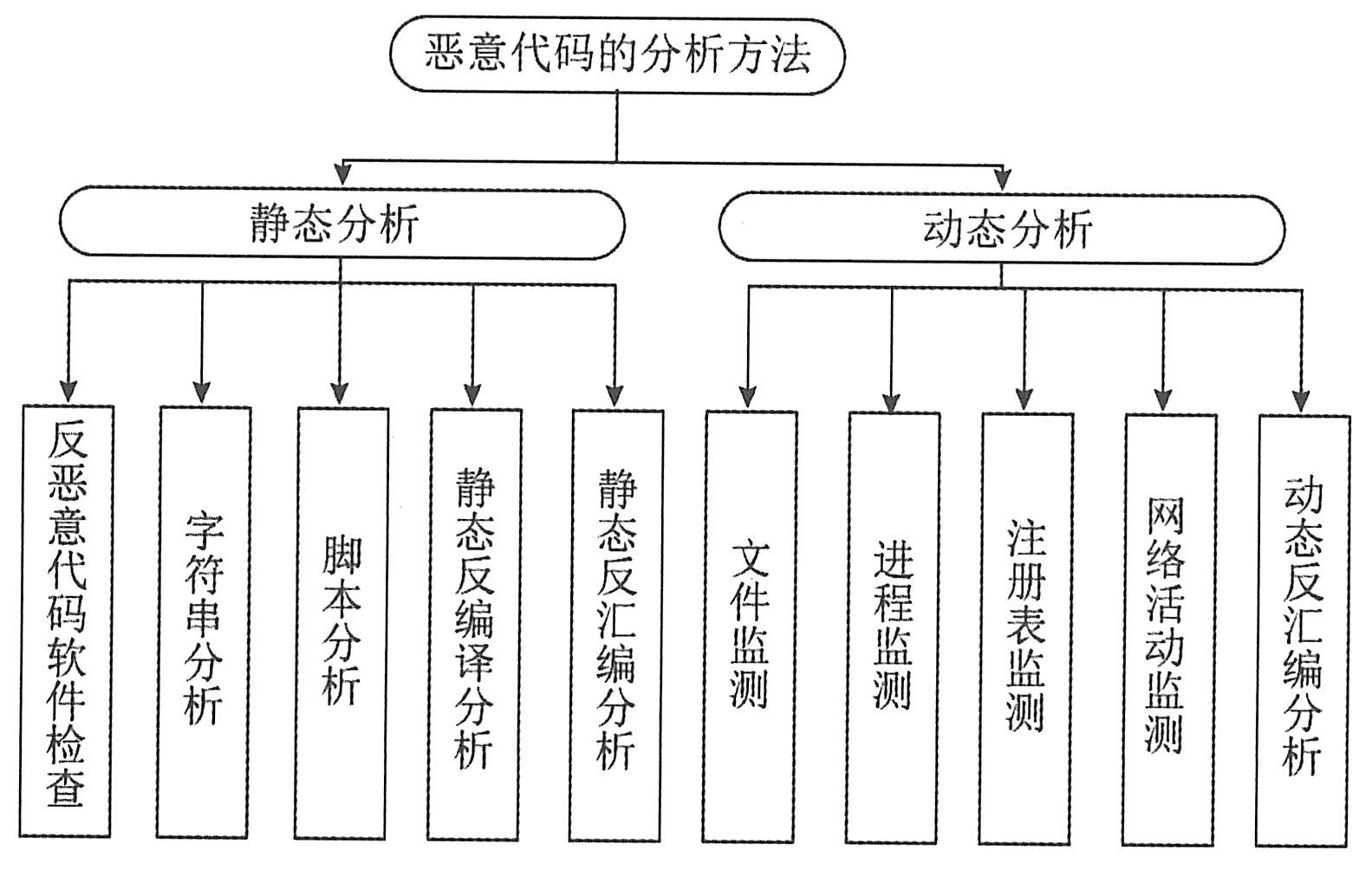 如下图所示,恶意代码的分析方法由静态分析方法和动态分析方法两部分构成。其中,静态分析方法有反恶意代码软件的检查、字符串分析和静态反编译分析等;动态分析方法包括文件监测、进程监测、注册表监测和动态反汇编分析等。