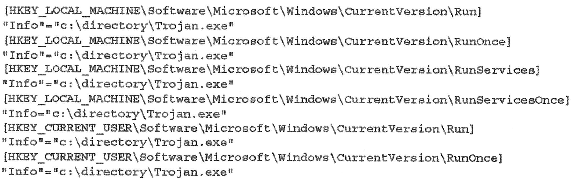 Windows类型的木马常通过修改注册表的键值来控制木马的自启动,该方法的基本原理是检查计算机的注册表键值异常情况以及对比已有木马的修改注册表的规律,综合确认系统是否受到木马侵害。如下图所示,Windows木马经常将注册表修改成以下信息。