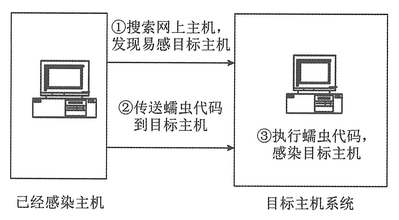 第三阶段,易感染目标主机执行蠕虫代码,感染目标主机系统。目标主机感染后,又开始第一阶段的工作,寻找下一个易感目标主机,重复第二、第三阶段的工作,直至蠕虫从主机系统被清除掉。