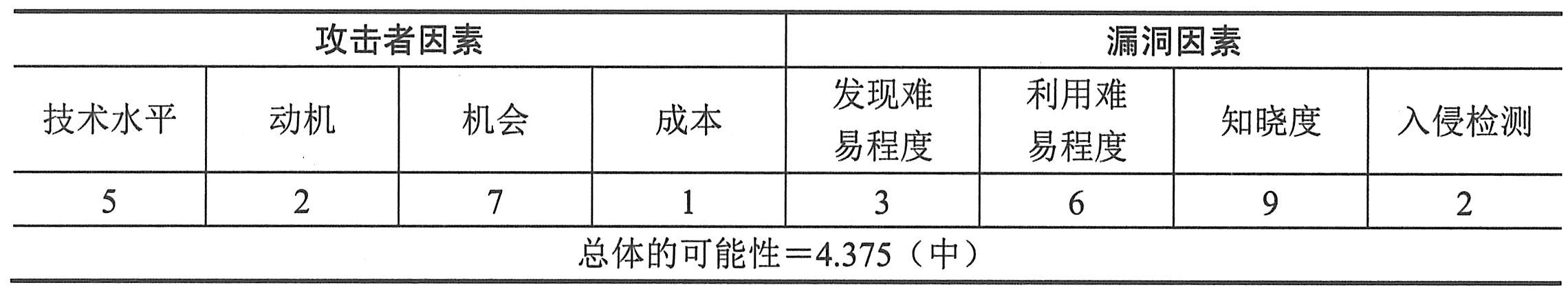 将可能性评估中的攻击者因素和漏洞因素按照0~9分进行评估,如下表所示。