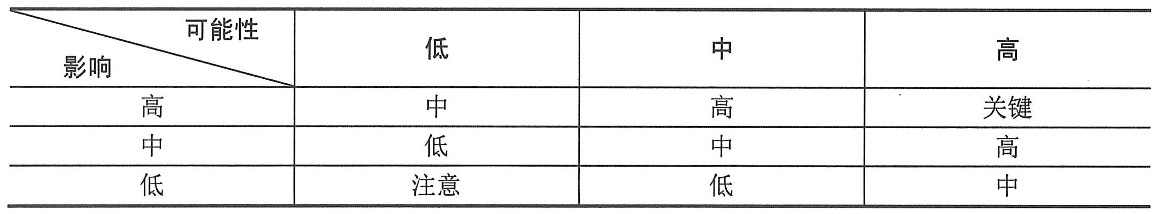 把可能性评估和影响评估放在一起,计算风险的总体严重程度。可能性评估和影响评估分成0~9的级别,如下表所示。