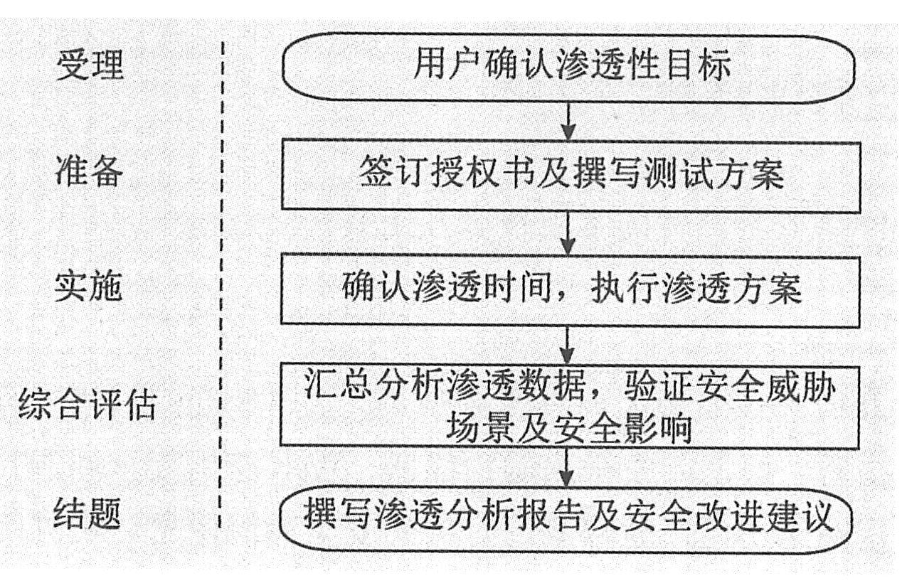 知识路径:  > 网络安全测评技术与标准  > 网络安全测评流程与内容  > 网络安全渗透测试流程与内容  > 网络安全渗透测试的过程(委托受理、准备、实施、综合评估、结题五个阶段)