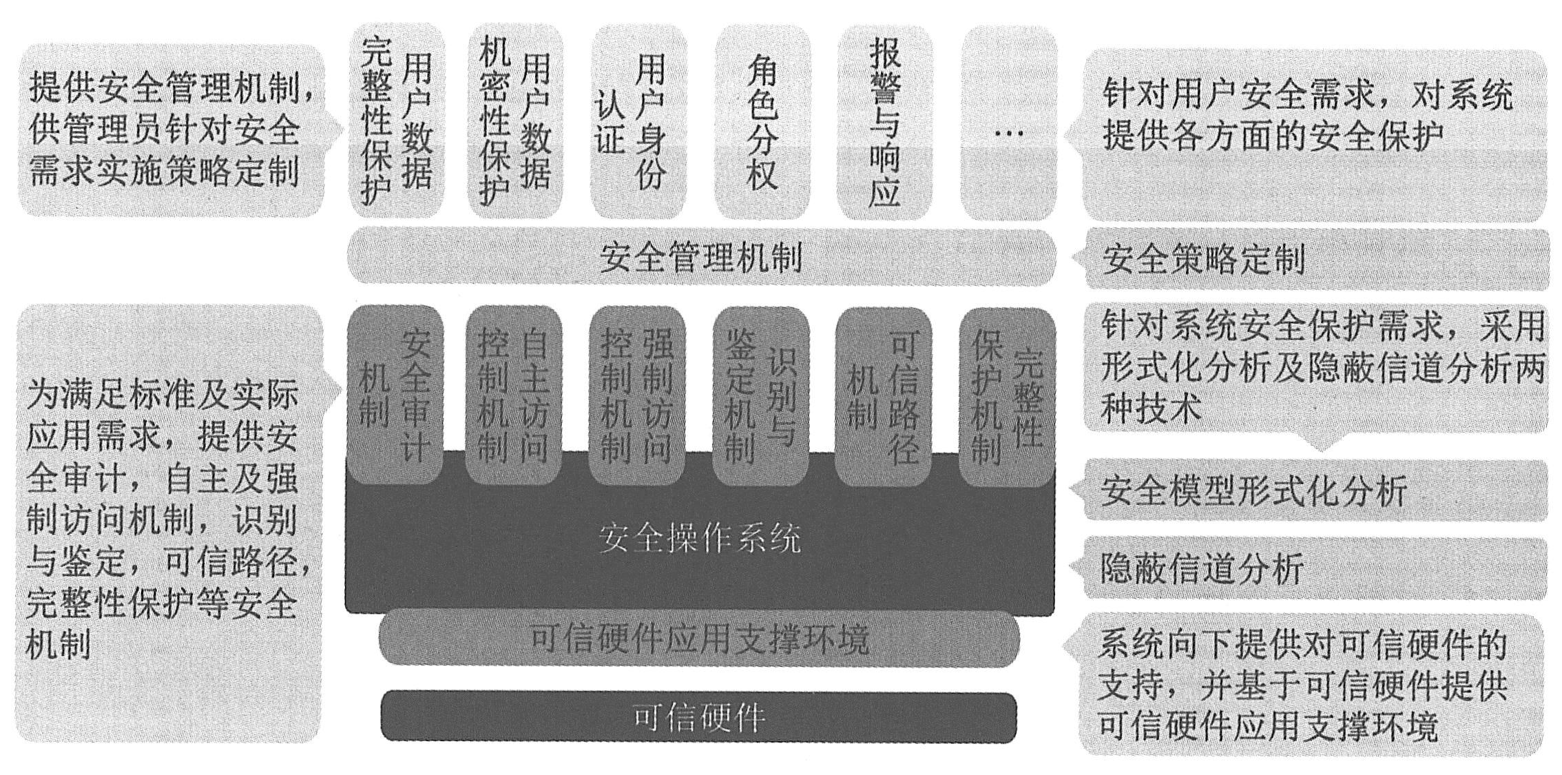 中标麒麟可信操作系统结合可信计算技术和操作系统安全技术,通过信任链的建立及传递实现对平台软硬件的完整性度量。中标麒麟可信操作系统的主要功能如下: