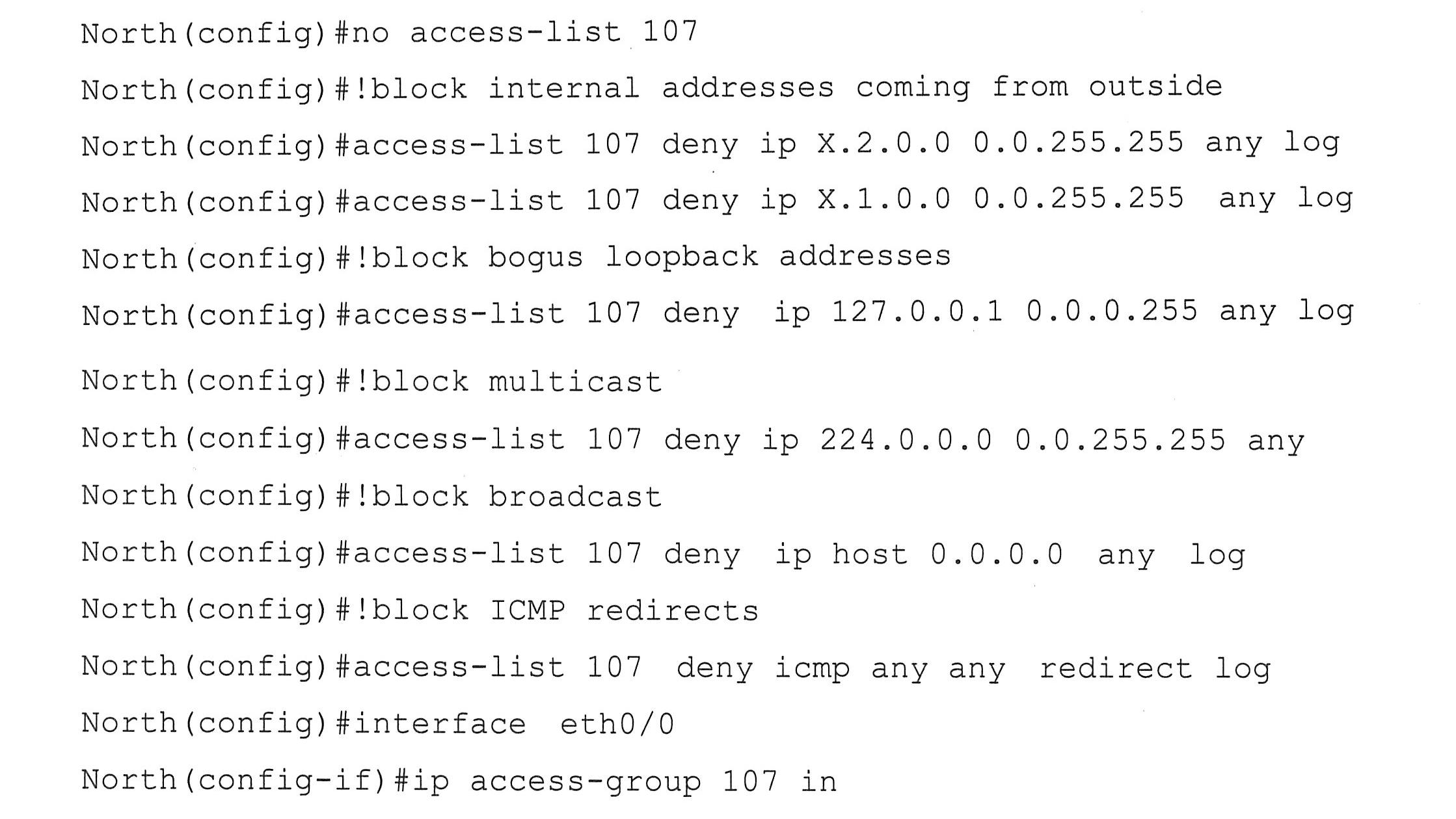下面是一个名为North的路由器的安全配置,其作用是阻断恶意数据包,配置信息如下: