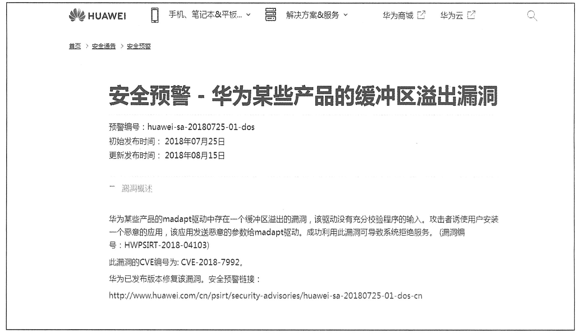 华为PSIRT负责接受、处理和公开披露华为产品和解决方案相关的安全漏洞,同时华为PSIRT是公司对漏洞信息进行披露的唯一出口。华为鼓励漏洞研究人员、行业组织、政府机构和供应商主动将与华为产品相关的安全漏洞报告给华为PSIRT。如下图所示,该图是华为公司公布的其产品相关的漏洞信息。