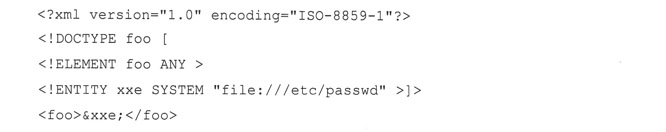 许多较早的或配置错误的XML处理器评估了XML文件中的外部实体引用。攻击者可以利用外部实体窃取使用URI文件处理器的内部文件和共享文件、监听内部扫描端口、执行远程代码和实施拒绝服务攻击。该漏洞的出现场景举例如下:
