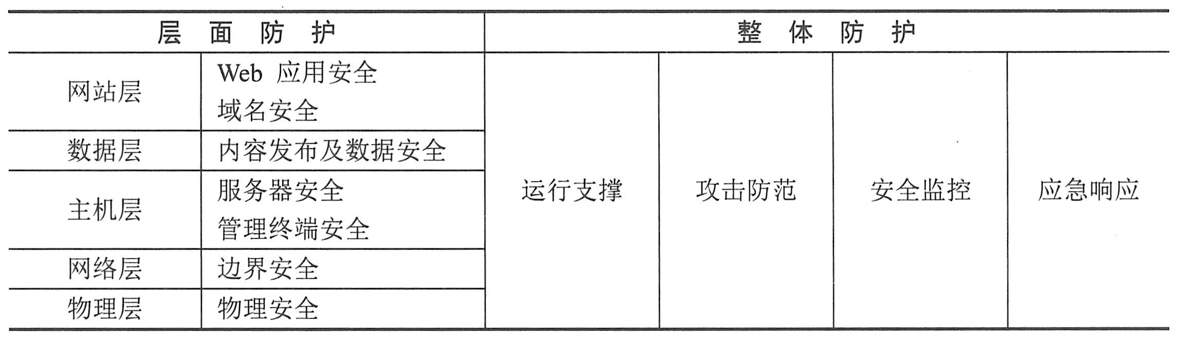 网站安全保护涉及国家法律法规、政策文件、组织管理、标准规范、运行环境、产品技术、应用开发、安全测评、应急响应等多个方面的内容。目前,针对政府网站,国家颁布了《关于加强政府网站域名管理的通知》《政府网站发展指引》《关于加强党政机关网站安全管理的通知》《信息安全技术政府门户网站系统安全技术指南》(GB/T 31506—2015)等。其中,GB/T 31506—2015提出政府门户网站系统安全技术措施要求,如下表所示。