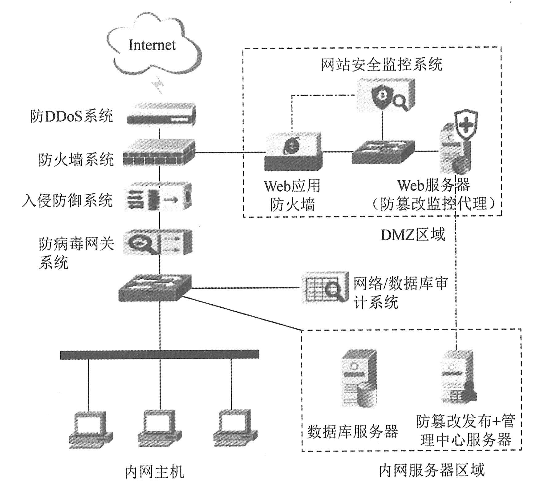 (1)DDoS防御。在政务网站与互联网边界处部署防DDoS攻击系统,用于防护来自互联网的拒绝服务攻击。