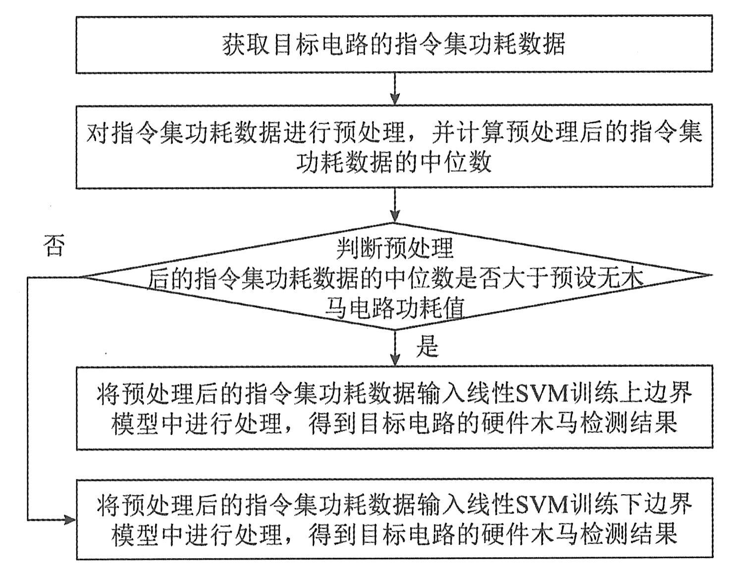 硬件木马检测方法有反向分析法、功耗分析法、侧信道分析法。其中,反向分析法是通过逆向工程方法将封装(或管芯)的芯片电路打开,逐层扫描拍照电路,然后使用图形分析软件和电路提取软件重建电路结构图,将恢复出的设计与原始设计进行对比分析,以检测硬件木马。功耗分析法通过获取芯片的功耗特征,通过K.L扩展分析法生成芯片指纹,再将待测芯片与“纯净芯片”的功耗特征进行比对,以判断芯片是否被篡改。侧信道分析法是通过比对电路中的物理特性和旁路信息的不同,发现电路的变化,其技术原理是任何硬件电路的改变都会反映在一些电路参数上,如功率、时序、电磁、热等,其流程如下图所示。