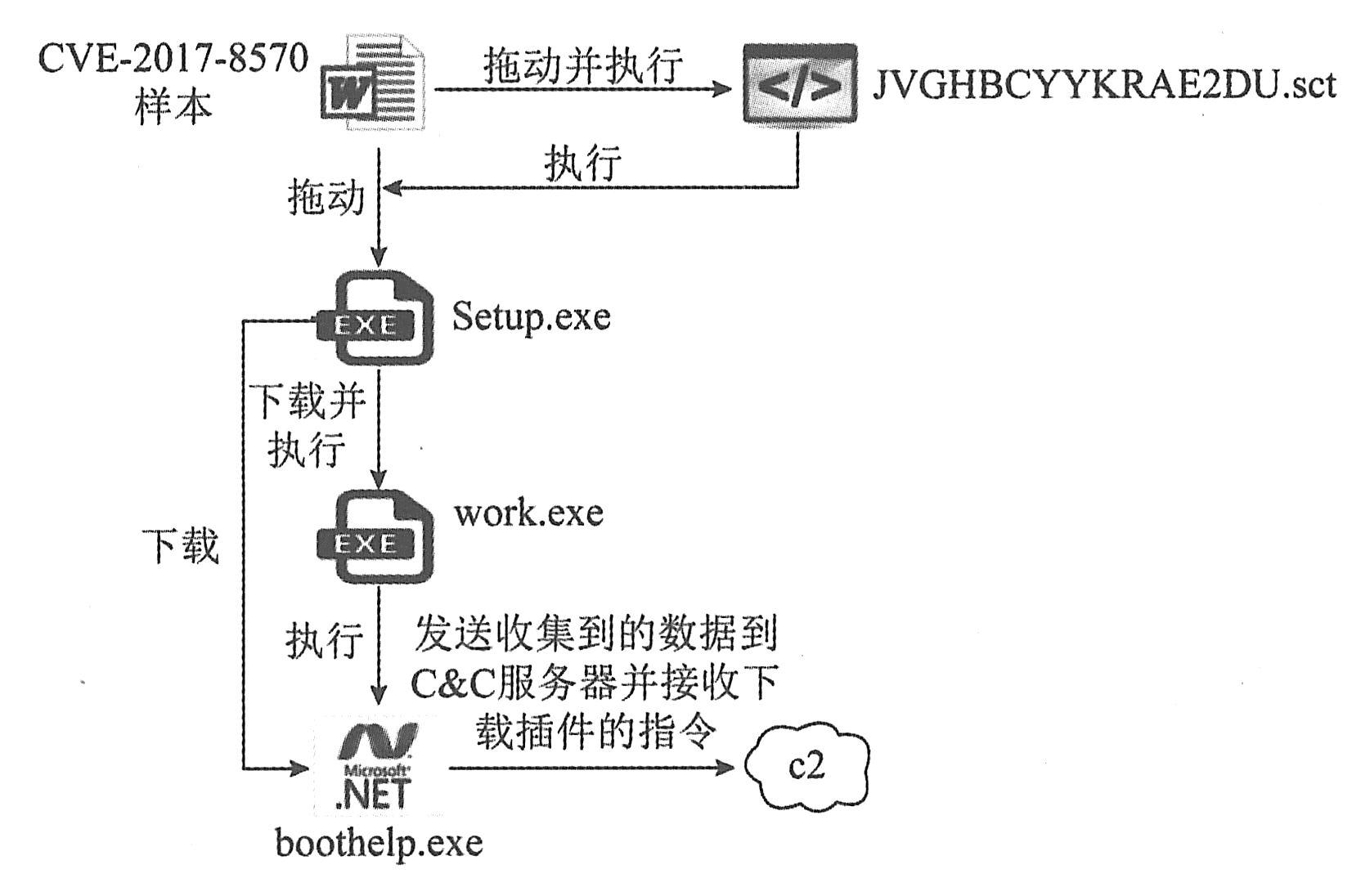 高级持续威胁(简称为APT)是复杂性攻击技术,通常将恶意代码嵌入Word文档、Excel文档、PPT文档、PDF文档或电子邮件中,以实现更隐蔽的网络攻击,以逃避普通的网络安全检查。例如,肚脑虫(Donot)组织以“克什米尔问题”命名的诱饵漏洞文档,该文档利用了CVE-2017-8570漏洞,其主要的攻击流程如下图所示。