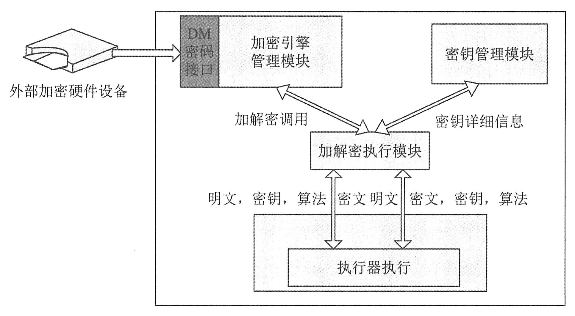 达梦数据库管理系统(DM)数据存储加密解决方案是达梦针对高度机密信息系统的数据保密性需求提供的一个安全解决方案,以填补传统数据库加密设计的缺陷。达梦数据库管理系统提供了内部算法加密、第三方软硬件存储加密和透明加密、半透明加密、非透明加密等一套使用方便、灵活可靠的信息存储加密功能,为保证关键数据的安全提供了强大的支撑环境。DM数据库实现了密码引擎,能够将外部密码设备抽象为一组调用接口,对其进行管理与调用,从而实现第三方的密码设备、密码算法调用的支持,如下图所示。
