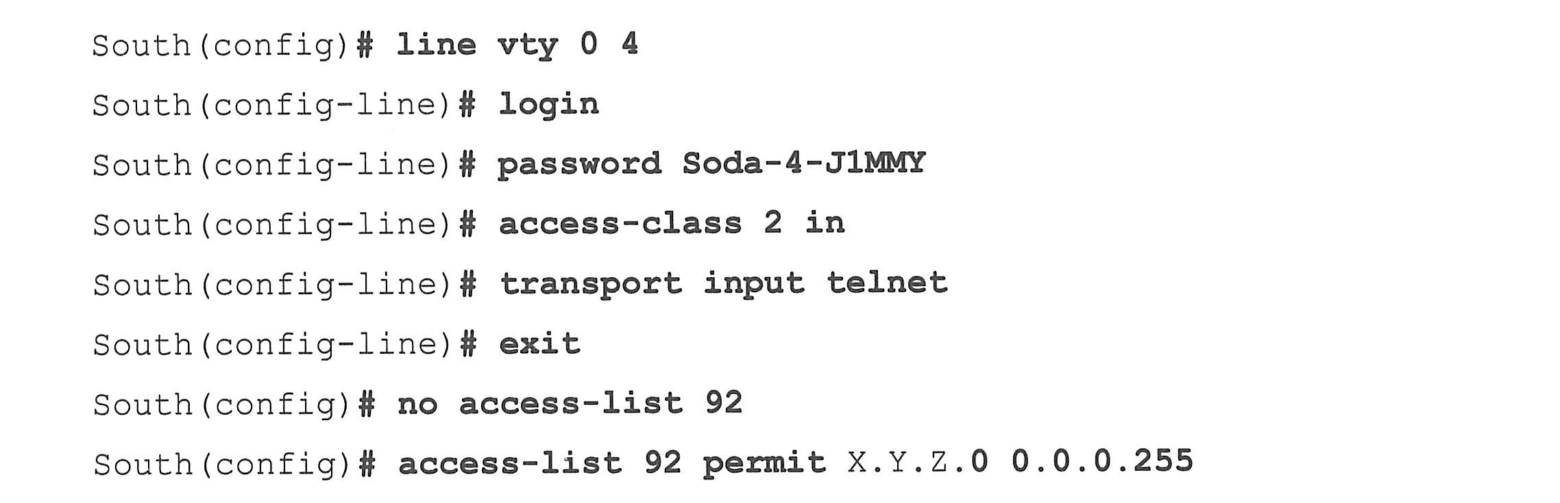 路由器south通过上述安全配置,用户只有提供正确的口令才能访问VTY,并且只能从网络X.Y.Z登录。