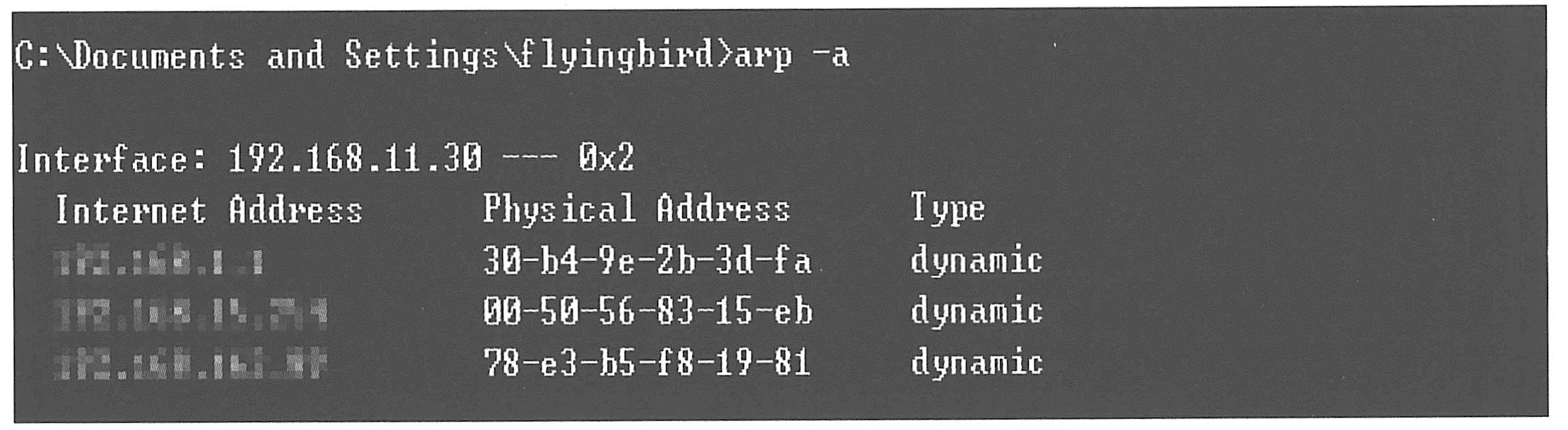 用arp命令查看受害机器的地址解析缓存表,如下图所示。