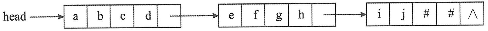 (2)链式存储。字符串也可以采用链表作为存储结构,当用链表存储串中的字符时,每个结点中可以存储一个字符,也可以存储多个字符,需要考虑存储密度问题。结点大小为4的块链如下图所示。