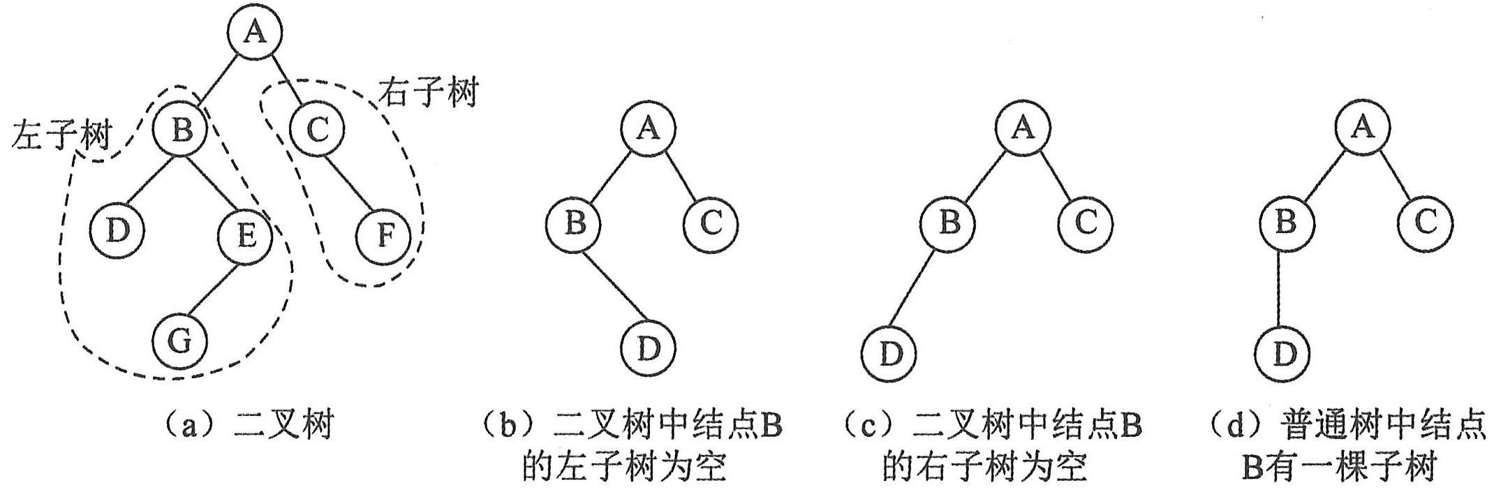 尽管树和二叉树的概念之间有许多联系,但它们有区别。树和二叉树之间最主要的区别是:二叉树中结点的子树要区分左子树和右子树,即使在结点只有一棵子树的情况下也要明确指出该子树是左子树还是右子树,树中则不区分,如下图所示。另外,二叉树中结点的最大度为2,而树中不限制结点的度数。