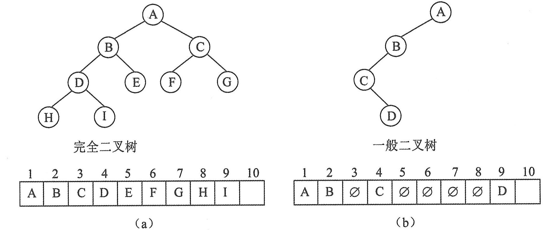 显然,顺序存储结构对完全二叉树而言既简单又节省空间,而对于一般二叉树则不适用。因为在顺序存储结构中,以结点在存储单元中的位置来表示结点之间的关系,那么对于一般的二叉树来说,也必须按照完全二叉树的形式存储,也就是要添上一些实际并不存在的“虚结点”,这将造成空间的浪费,如上图(b)所示。
