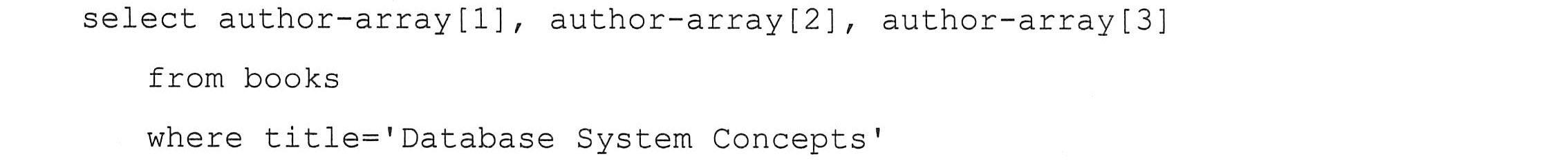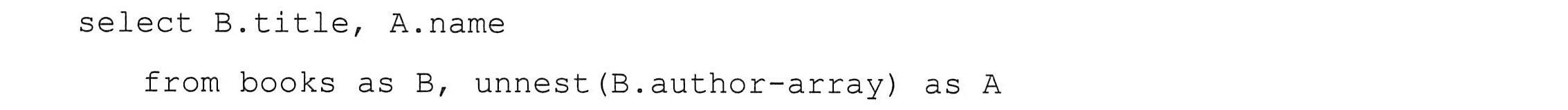 unnest(keyword-set)在无嵌套关系的SQL中相当于一个select-from-where的子表达式。如果我们知道一本特定的书具有三个作者,我们会这样写: