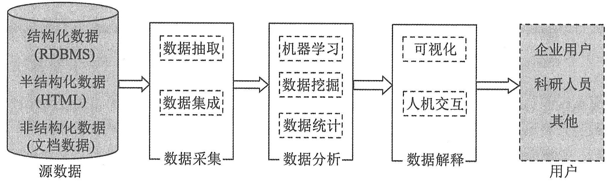 从大数据生命周期的角度看,大数据处理的基本流程包括:数据采集、数据分析和数据解释。大数据处理流程图如下图所示。