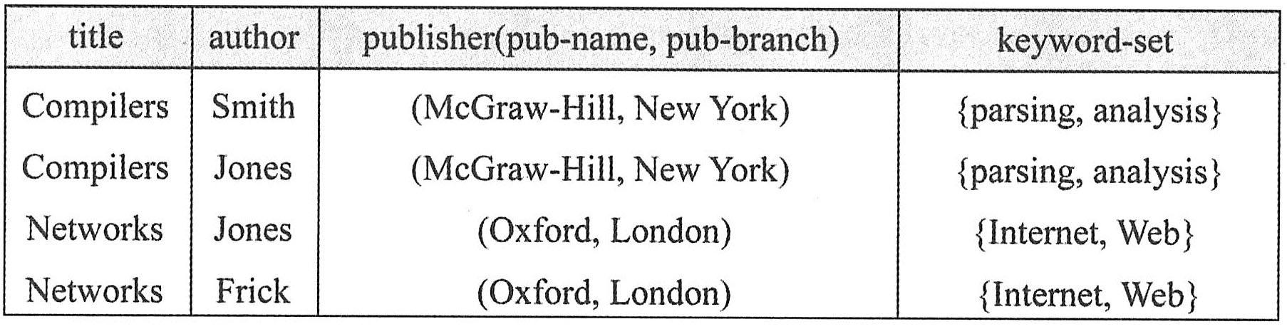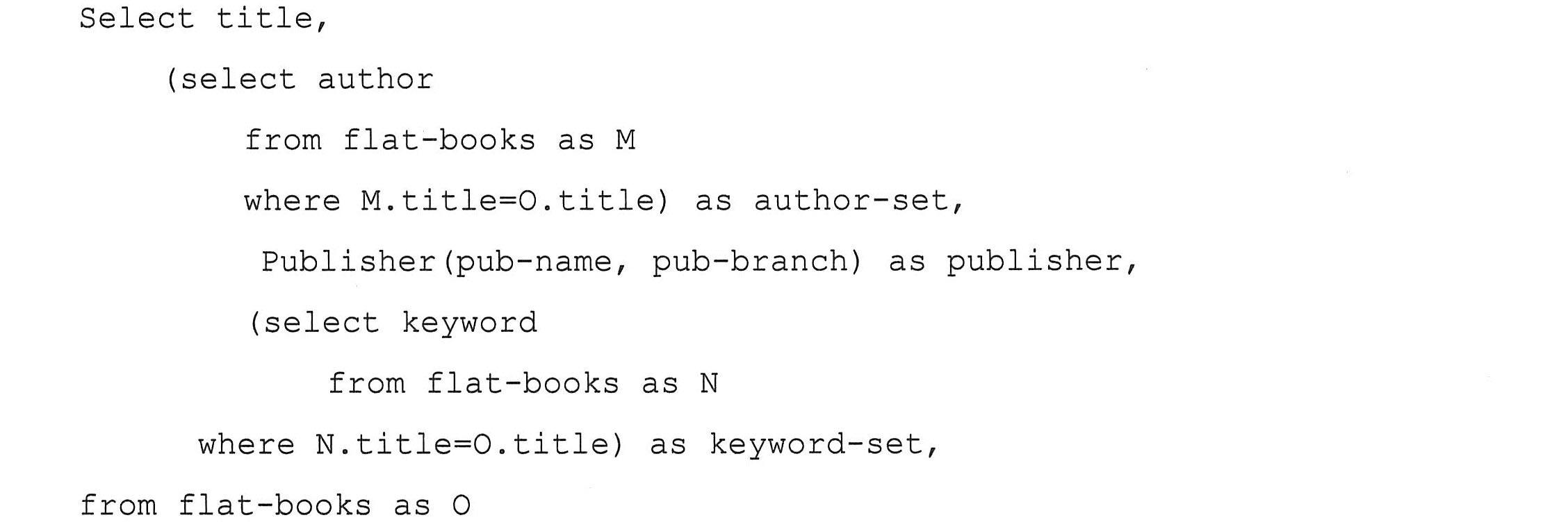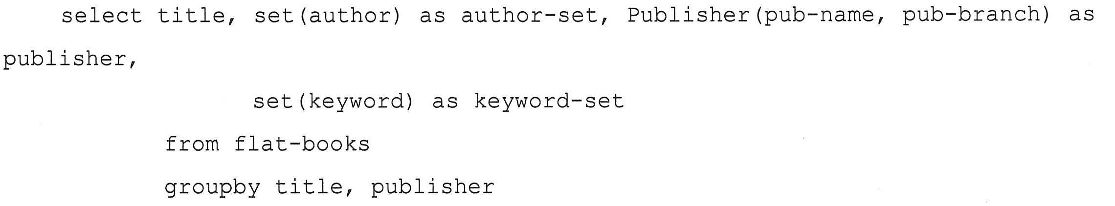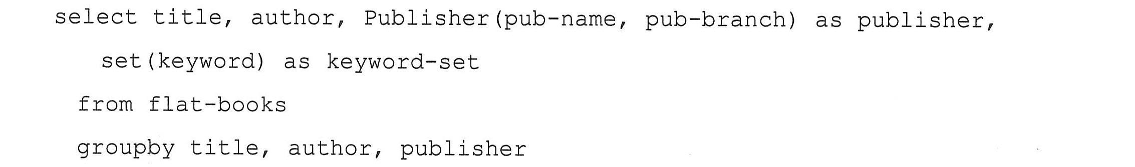 假定我们有一个如上图所示的1NF关系flat-books,下面的查询在属性keyword上对关系进行了嵌套: