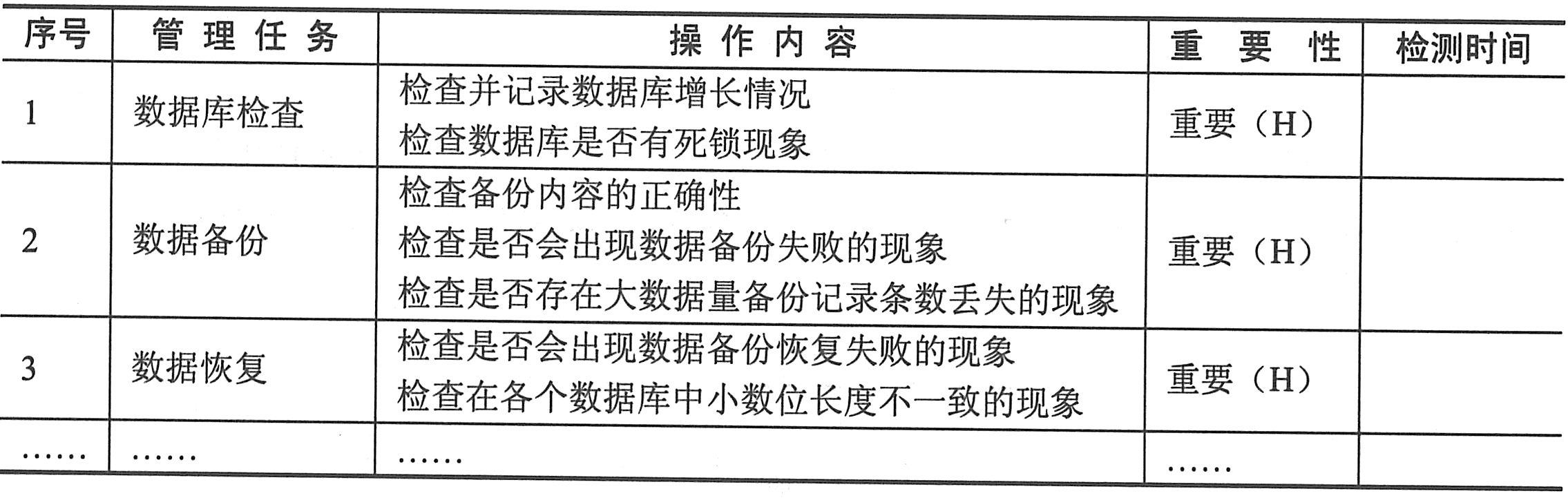 不同类型的信息系统的数据资源运行维护的重点是不相同的,比如,针对多用户在线应用的电子商务管理系统就要重点监控并发数,检测并释放挂起的进程,优化主要数据库的访问速度等;针对大数据量吞吐的系统则重点监控磁盘空间,优化I/O读/写速度等。因此,数据资源维护人员应该根据信息系统的侧重点制定合理的例行管理计划。一般情况下,例行管理计划中需列出监控检测的对象、重要性等级以及常规操作方法,监控检测的频次或周期、正常状态值和报警阈值等,如下表所示。