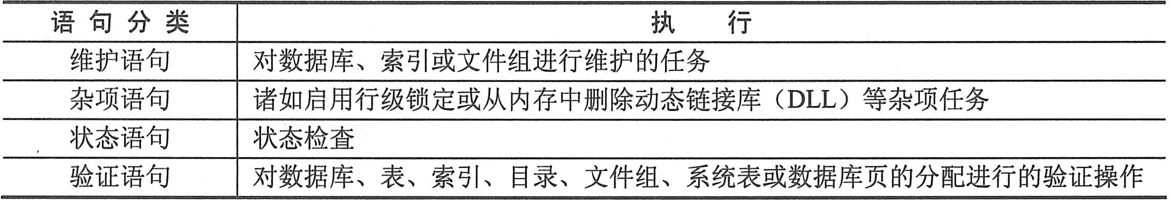 (2)数据库一致性检查:对数据库的物理和逻辑一致性进行检查,以SQL Server 2000数据库管理系统为例,系统提供数据库控制台命令DBCC,可用于数据库的一致性检查。DBCC语句分类如下表所示。