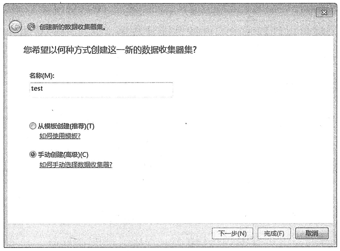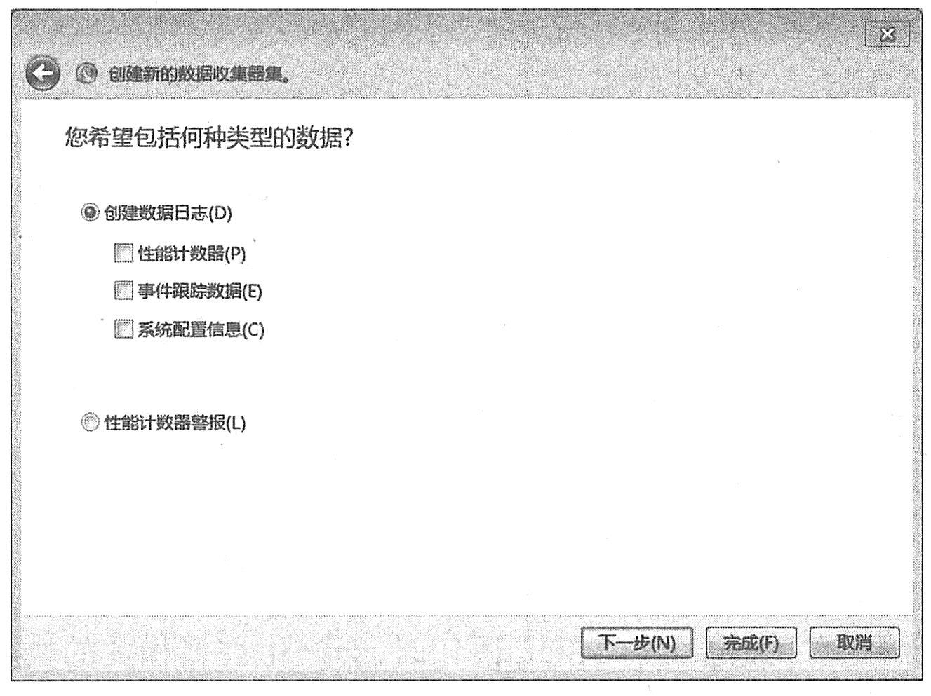 (2)右击“数据收集器集”|“用户定义”|“新建数据日志”|“手动创建”,输入数据收集器集名称,单击“下一步”,如上图所示。勾选“性能计数器”复选框,单击“完成”按钮,创建一个新的性能计数器日志,如下图所示。