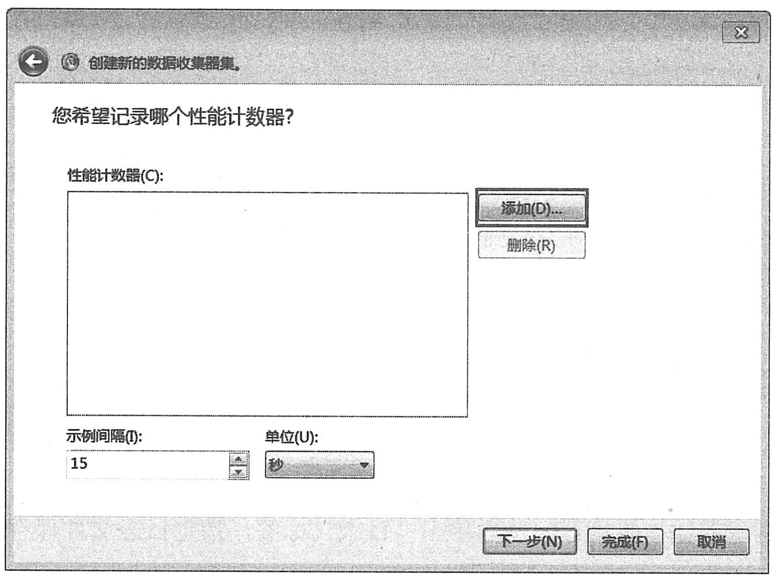 (3)单击“添加”按钮,选择一个需要的计数器,可以指定收集计数器数据的间隔时间,如下图所示。