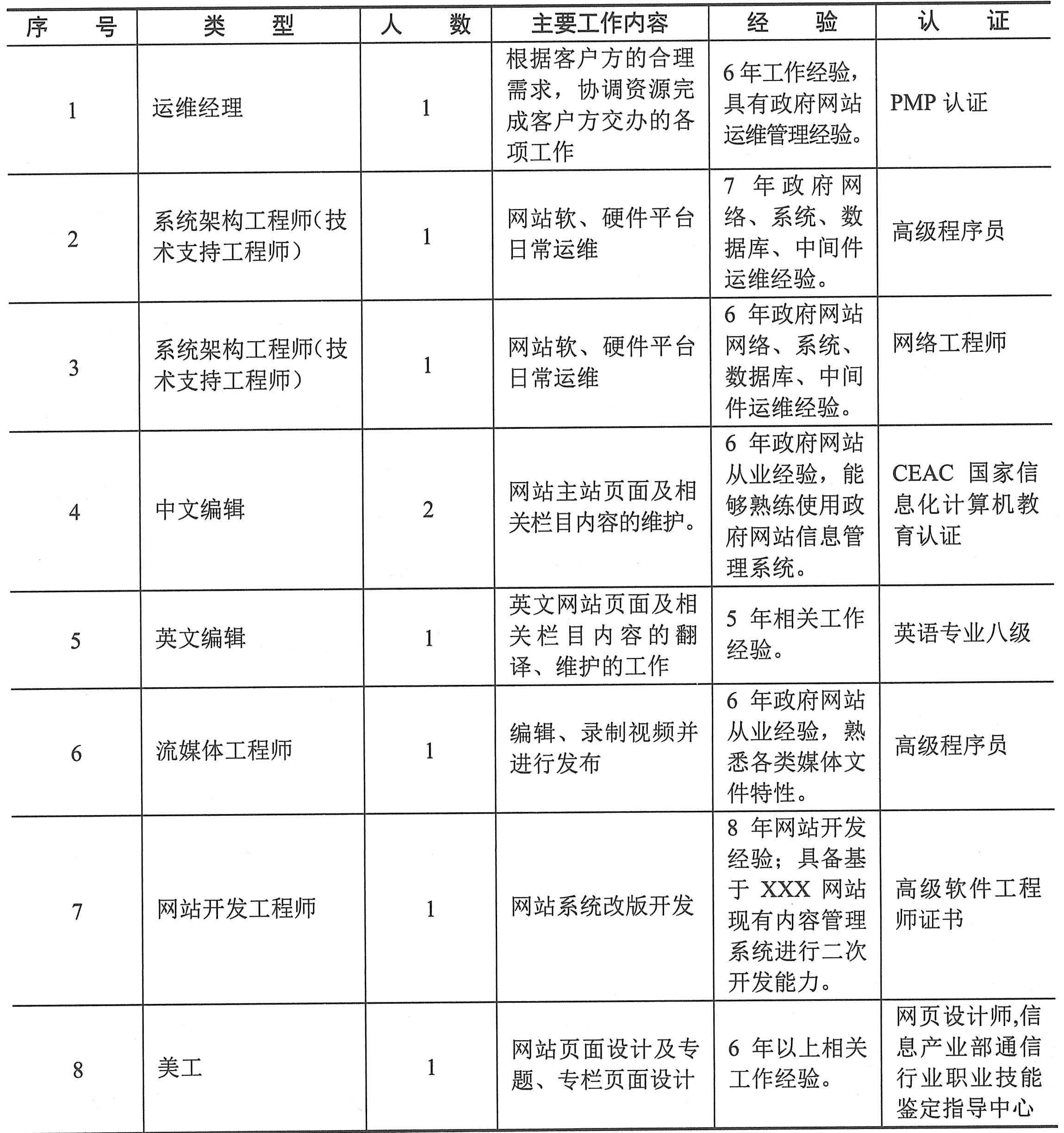 基于以上组建团队原则,本次项目的团队将由某公司的政府网站运维技术人员组建,科学地分析运维任务,拟定角色职责,设立工作岗位,组成运维机构;再根据人员的技术组成,指定其角色和岗位,这样三定(定人员、定角色、定岗位)后,形成的运维团队专人专职、人尽其才、角色交叉、技能备份,能高效、可控地执行运维工作。