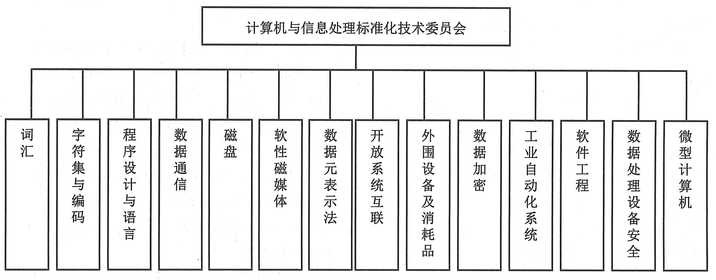 我国没有设立专门的信息技术标准化组织,负责信息技术标准化具体工作的主要组织是全国计算机与信息处理标准化技术委员会(学术团体)下属的各分技术委员会,其结构和组织分配如下图所示。