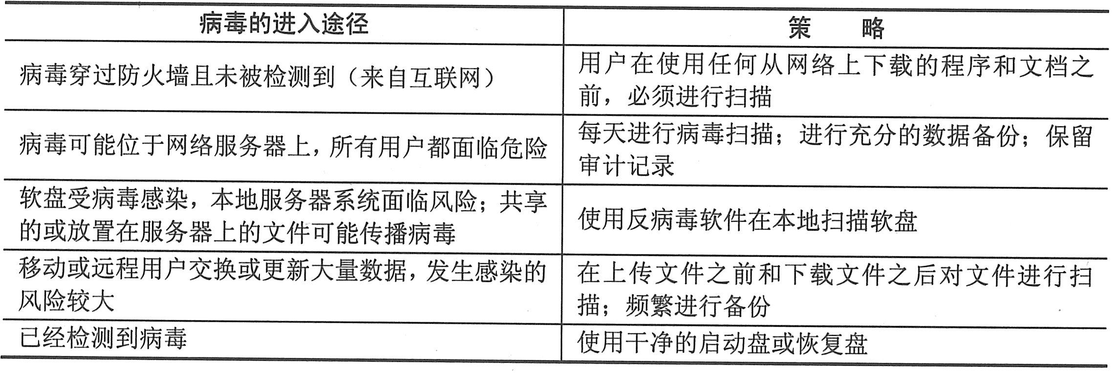 据国际计算机安全协会的统计,病毒的数量正在以每年30%的速度增加。组织如何保护自己免受病毒攻击已经成为一个紧迫的问题。最常见的解决方案是使用反病毒软件,但是反病毒软件只有在新病毒发起攻击之后,才能了解病毒的属性并提供保护机制,所以很难对新病毒的第一次攻击加以防范。常用防范病毒的策略如下表所示。