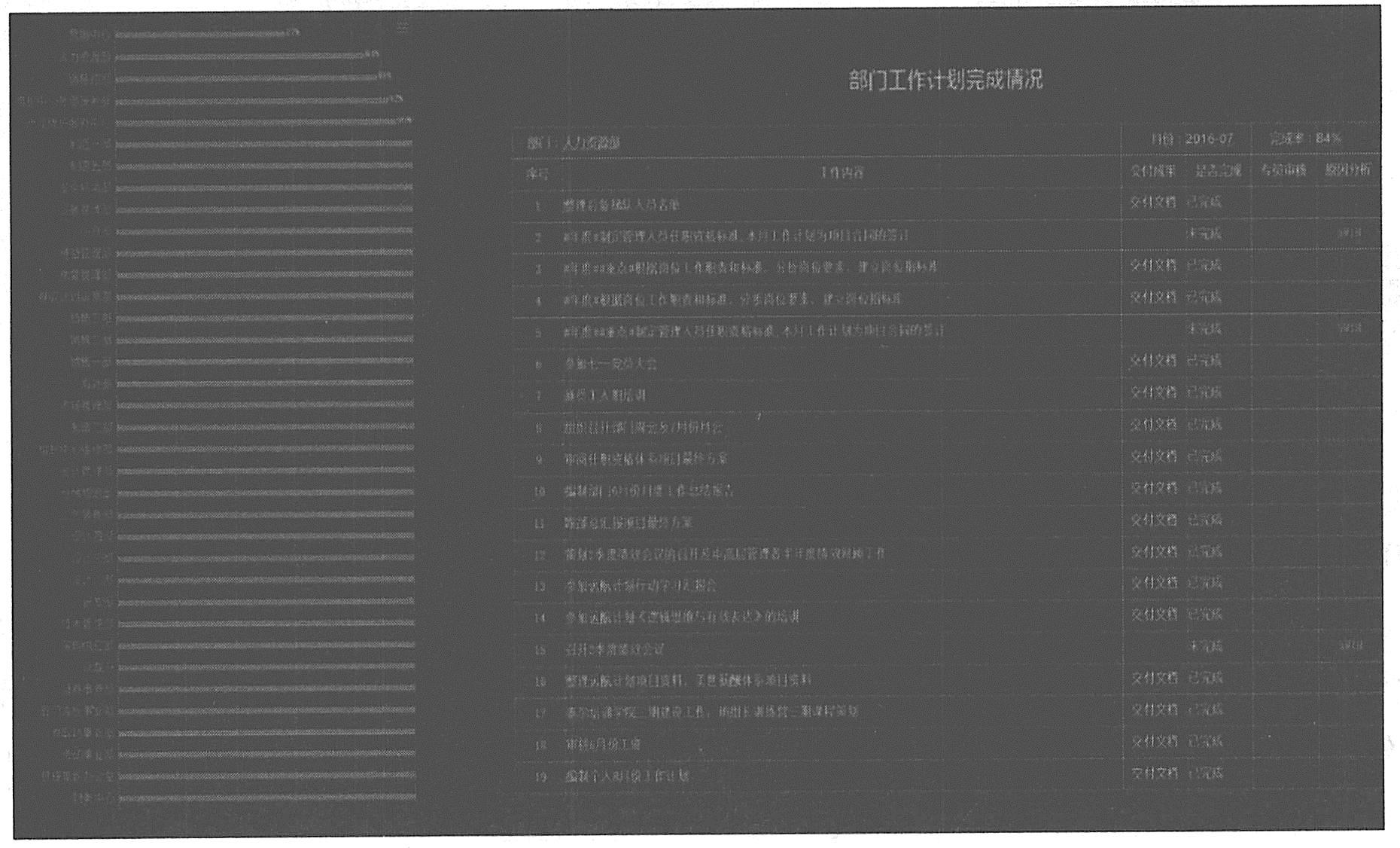 此看板是利用OA系统开发的一套工作体系。可以通过这个查看部门工作计划的完成情况,交付质量评定绩效,如下图所示。一定程度上记录了员工一年来工作的点滴。