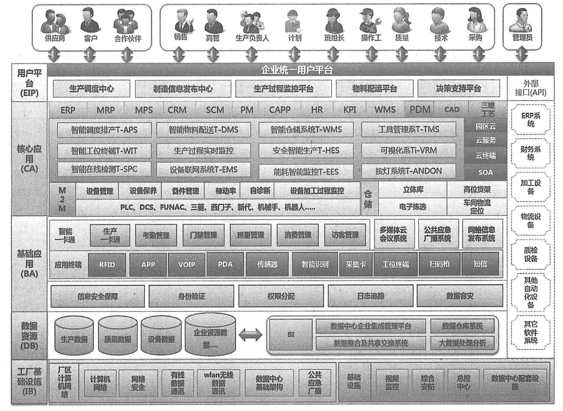 系统整体分为工厂基础设施层、数据资源层、基础应用层、核心应用层和用户平台5部分,如下图所示。