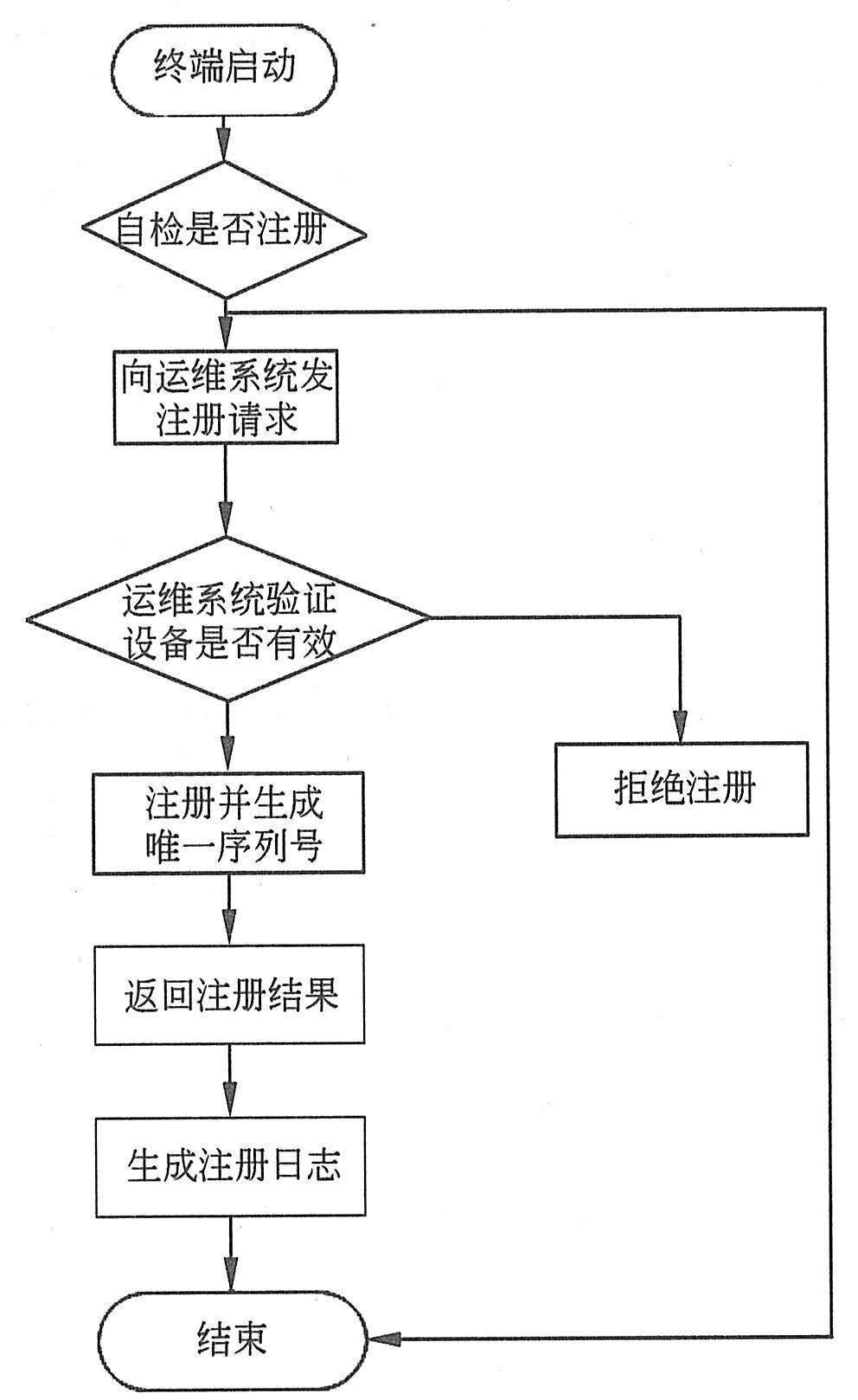 (5)终端注销。终端注销就是运维系统解除终端序列号与通信模组的绑定关系,而终端序列号仍然保持有效。终端注销可由终端主动发起,也可通过系统管理员发起。注销后的终端不能再登录平台。平台更新终端注册标识为已注销,并生成注销日志备查。