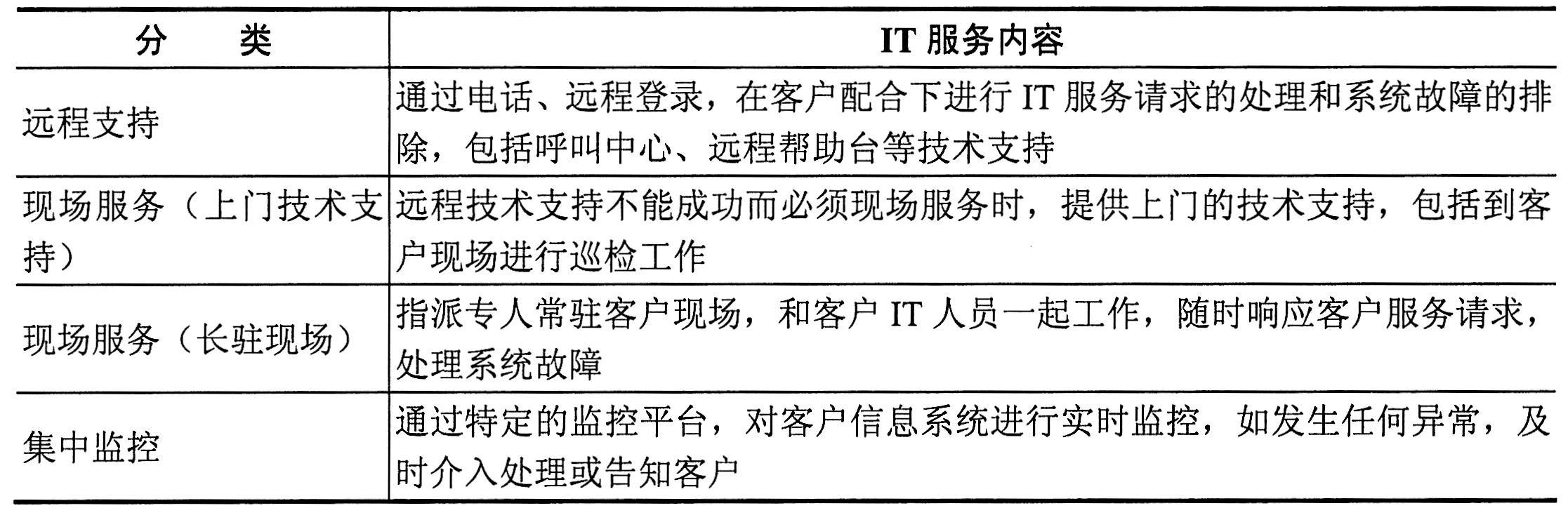 目前,常见的IT服务模式划分方法如下:①是将IT服务模式划分为远程支持(电话或邮件)、现场服务(上门技术支持、常驻现场)、集中监控等多种技术支持服务模式,如下表所示;②是将IT服务模式分为IT外包(ITO)、业务流程外包(BPO)和知识流程外包(KPO)等外包服务和新兴服务模式,如SaaS(Software as a Service)、云计算(Cloud Computing)等。