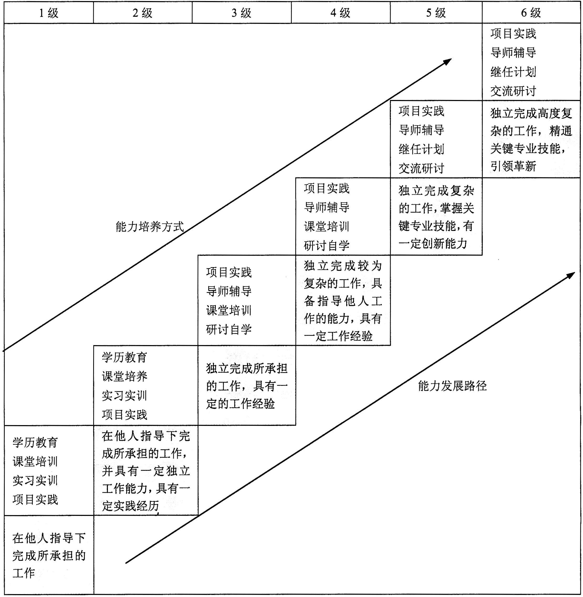 人社厅发[2012]72号《国家职业技能标准编制技术规程》将职业资格分为5个等级,规程更多地从技术工人的能力水平出发,考虑了技工层面的职业等级划分,而该标准根据我国信息技术服务行业特点、市场需求、职业种类的不同,以及知识、技能和经验的不同要求,将职业资格划分为6个等级,更加突出了信息技术服务从业人员高技术、高创新性的特点,强调了高级技术从业人员(高级架构设计、高级项目经理等)对于信息技术服务行业的重要性和引领作用。基于职业能力标准,通过客观公正、科学规范的评价和鉴定从业人员的能力水平,并授予合格者相应的职业资格等级。该标准职业等级划分如下表所示。