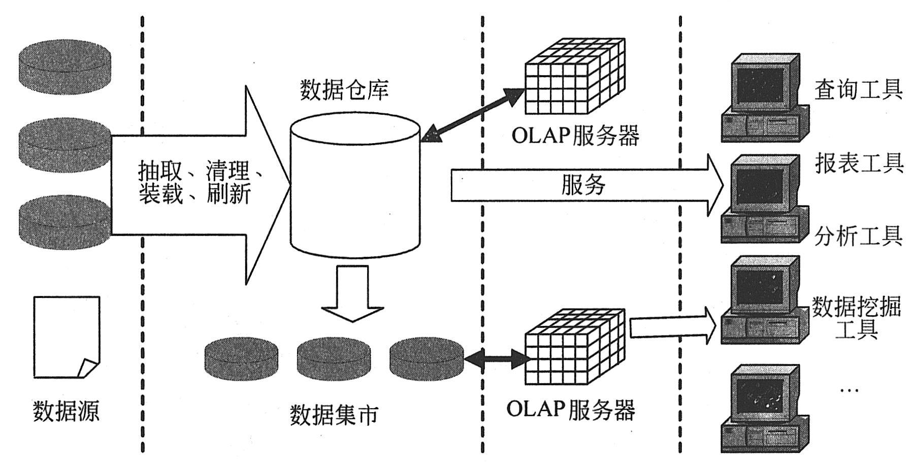 从数据仓库的概念结构来看,一般来说,数据仓库系统要包含数据源、数据准备区、数据仓库数据库、数据集市/知识挖掘库以及各种管理工具和应用工具,如下图所示。