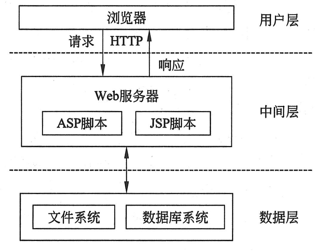 当前,一般的Web应用程序大都采用三层B/S结构:用户通过在浏览器中输入一个URL向Web服务器发出一个请求,Web服务器接收到一个请求以后,通过一些动态Web技术(如ASP、JSP等)处理请求,并和服务器端数据库系统或文件系统进行交互,得到响应结果,并将响应结果返回到用户的浏览器端,从而完成一次请求/响应的操作,在这个过程中,数据的传输是通过HTTP协议完成的。这种应用系统的框架结构如下图所示。