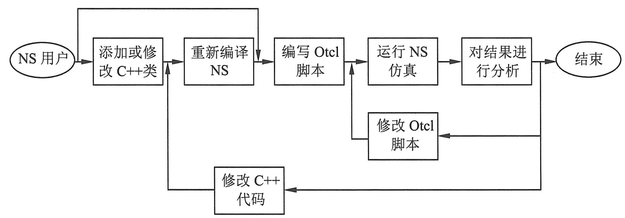 ①进行模拟前,首先要分析模拟涉及哪个层次。NS仿真分两个层次:一个是基于Otcl编程的层次,利用NS已有的网络元素实现模拟,无需对NS本身进行任何修改,只要编写Otcl脚本;另一个层次是基于C++和Otcl编程的层次,如果NS中没有所需要的网络元素,就需要首先对NS扩展,添加所需要的网络元素。这需要利用分裂对象模型,添加新的C++类和Otcl类,然后再编写Otcl脚本。如下图所示为NS仿真流程。